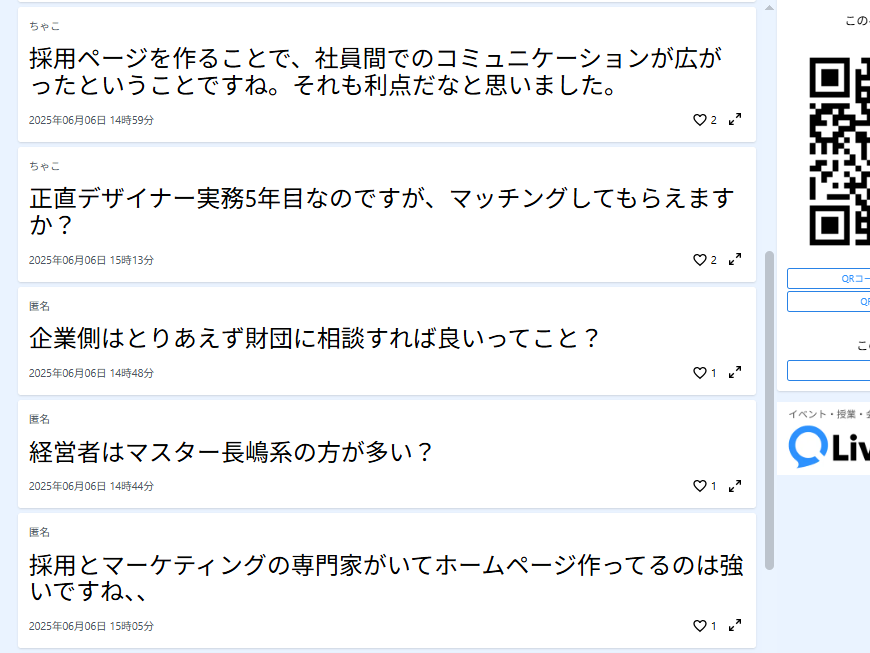 限られた時間の中で、事業内容や強み、実績などを発表いただきました。プロダクトデザインやイラストの制作で大手企業との取引実績があるベテランの方、今年起業されたばかりの方、建築や空間のデザインをされる方など、得意分野や経歴の異なる様々な方が登壇され、会場からもリアルタイムQAツールに多くの投稿が寄せられました。