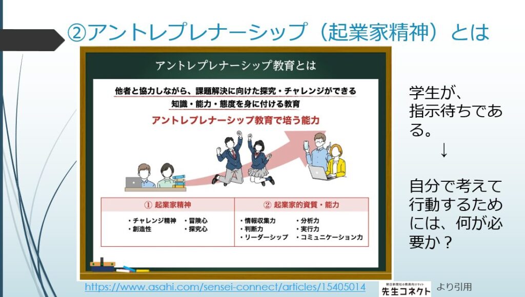 今回は、神戸市教育委員会が主導するエンジニア育成事業「K-SMART」の一環として、神戸市教育委員会から財団に依頼をいただき、工業高校等の教員を対象に、「アントレプレナーシップ(起業家精神)とは」のテーマで講演をしました。