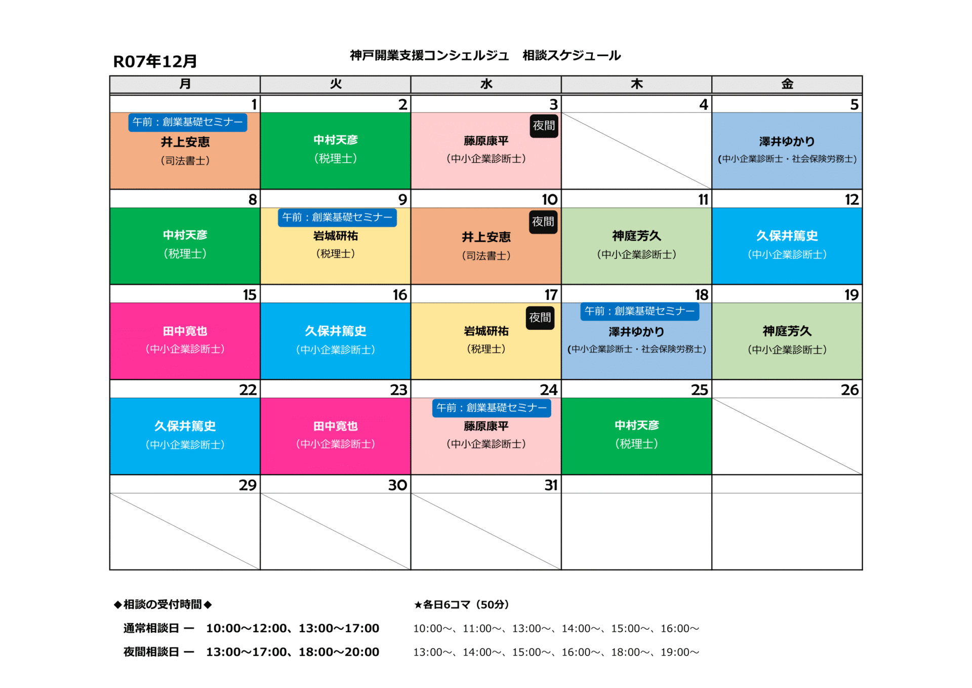 - 夜間 夜間 のマークがある日は、個別創業相談が「夜間相談日」の時間帯になります。