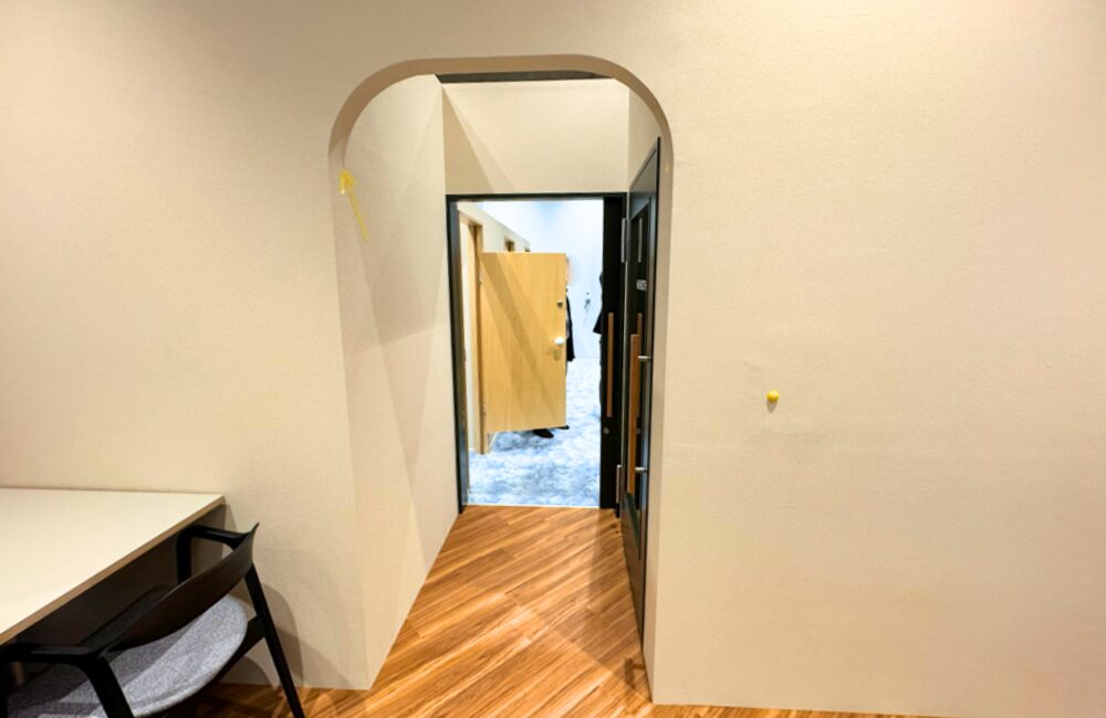 交流スペースとスタートアップブースの間の壁(アールデザイン)