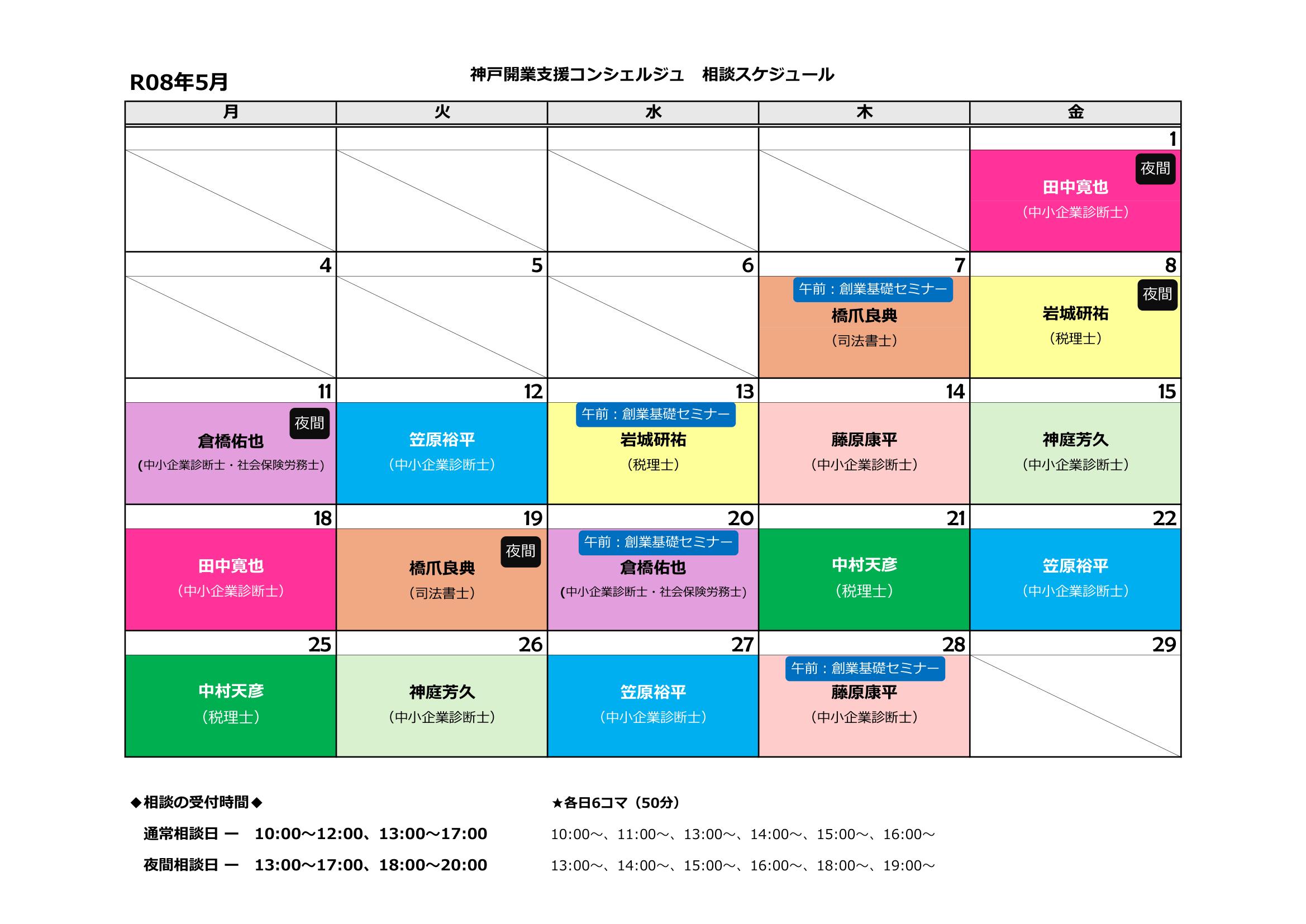 - 夜間 夜間 のマークがある日は、個別創業相談が「夜間相談日」の時間帯になります。
