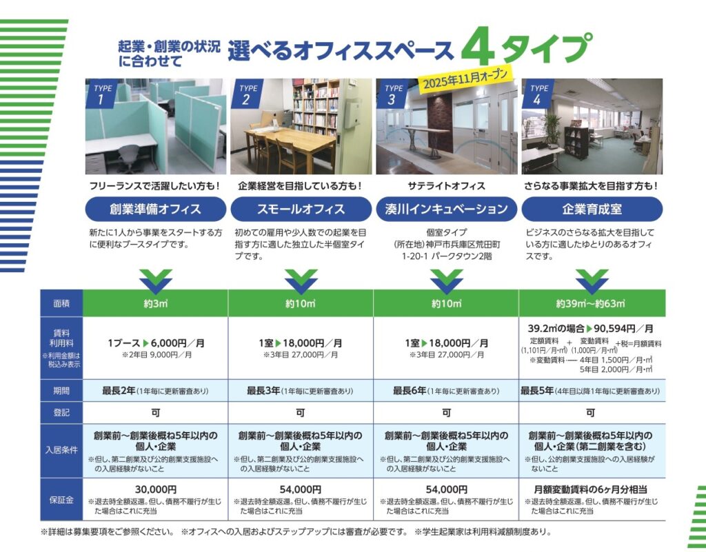 ※スモールオフィス、湊川インキュベーション、企業育成室は現在満室のため、募集しておりません。