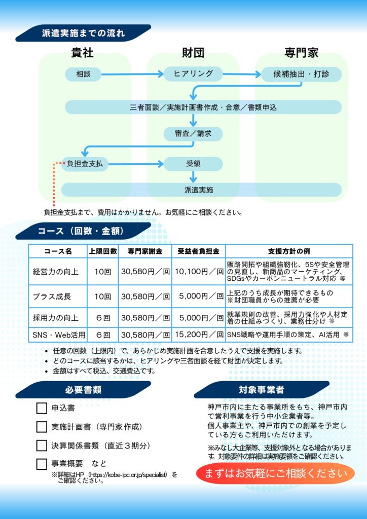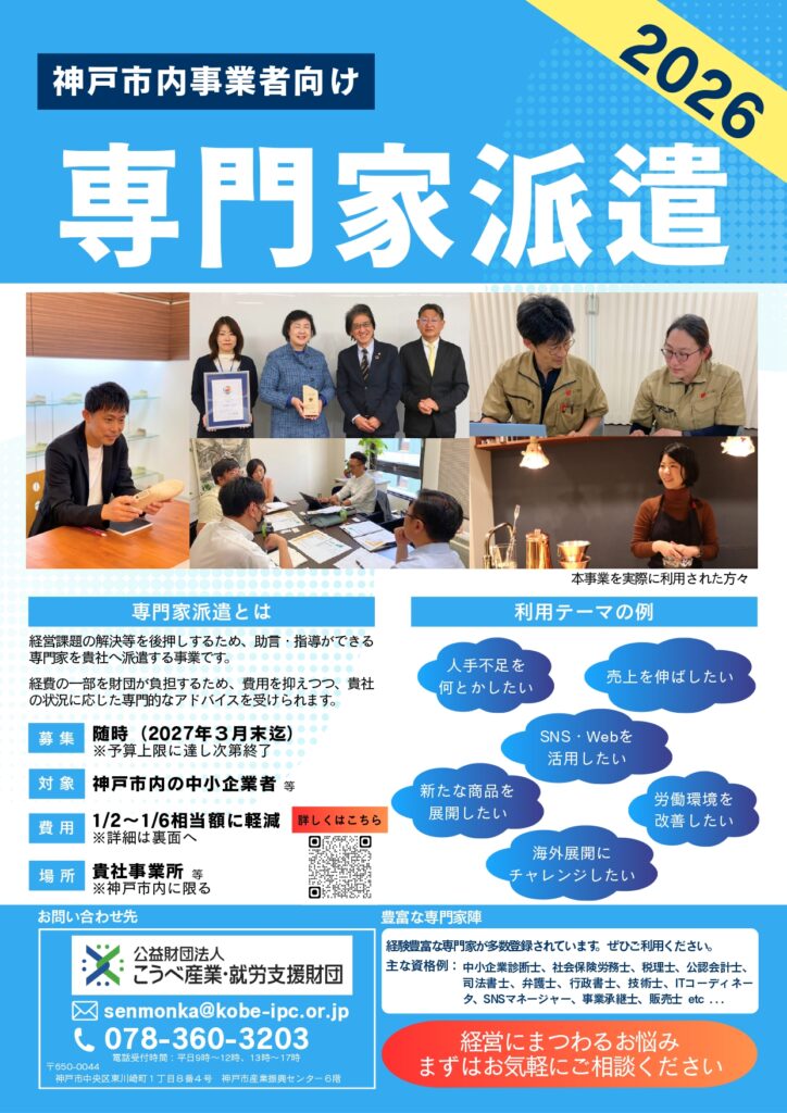 専門家派遣担当 TEL:078-360-3203(平日9:00~12:00、13:00~17:00、土日祝日を除く)